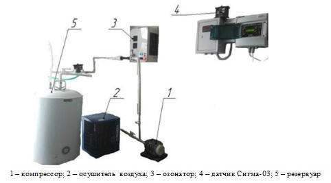 Рис. 1. Экспериментальная установка по озонированию посевного материала: 1 — компрессор; 2 — осушитель воздуха; 3 — озонатор; 4 — датчик Сигма-03; 5 — резервуар.
