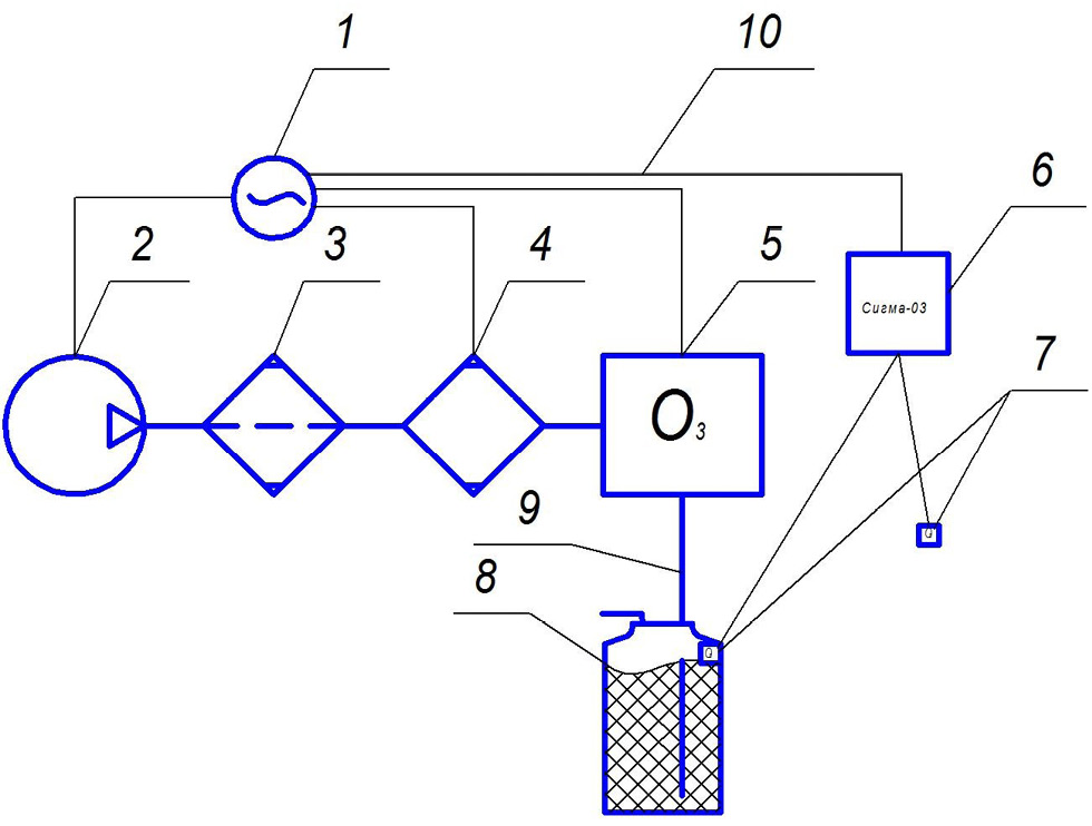 Рис. 2. Схема экспериментальной установки по озонированию посевного материала: 1 — источник переменного тока; 2 — компрессор; 3 — фильтр; 4 — осушитель воздуха; 5 — озонатор; 6 — газоанализатор; 7 — датчики концентрации газа; 8 — емкость; 9 — газопроводы; 10 — электрические линии.