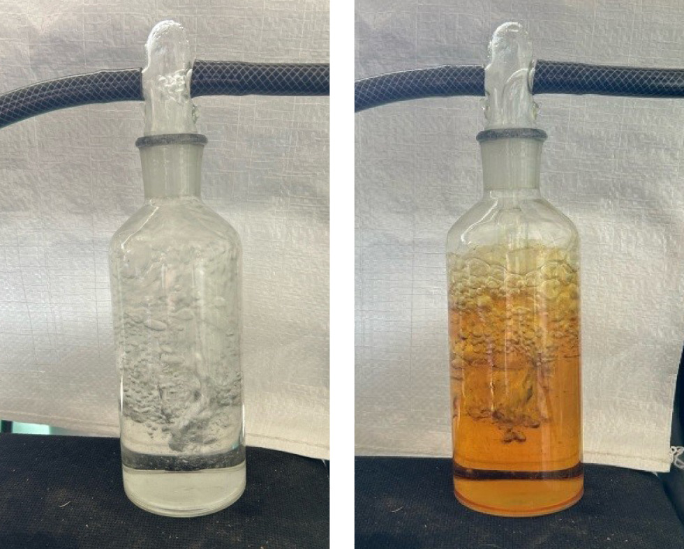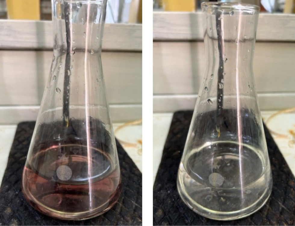 Fig. 5. Color change of the iodine solution aliquot after the addition of starch (left) and at the end of the addition of sodium thiosulfate (right).