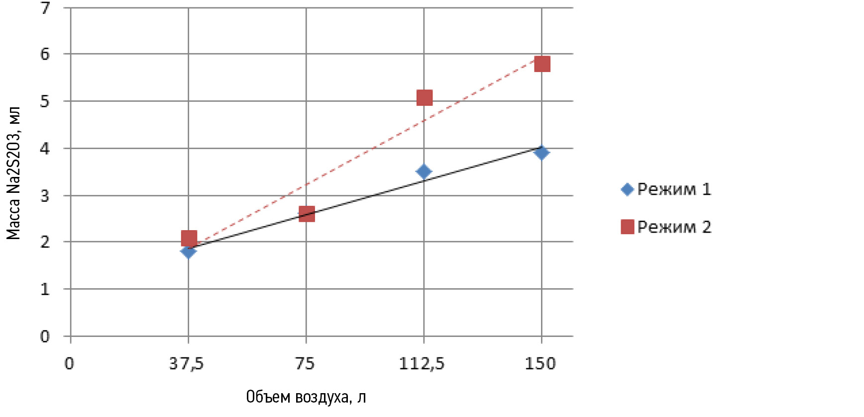 После чего часть раствора йодистого калия помещали в барботер и пропускали озоновоздушную смесь в первом режиме с расходом 450 л/ч (рис. 3).