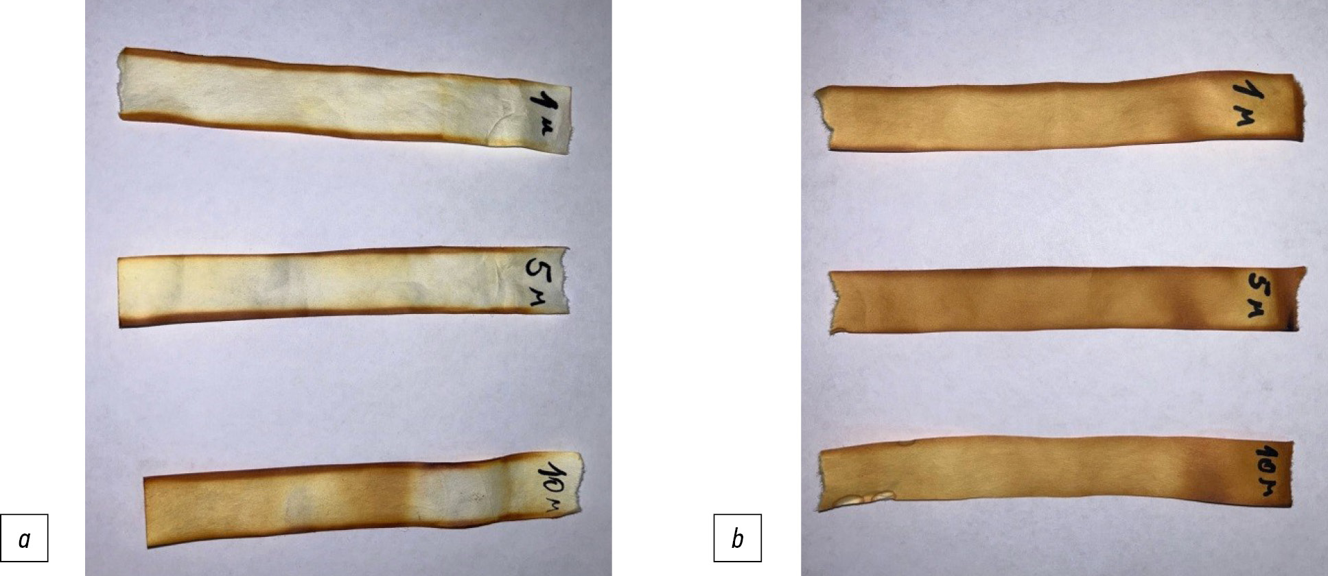 Fig. 7. Changing the color of test strips during the determining the ozone content in the air: а — the test strips with the content of the ozone-air mixture of 19.2 mg/m³; b — the test strips with the content of the ozone-air mixture of 36.3 mg/m³.
