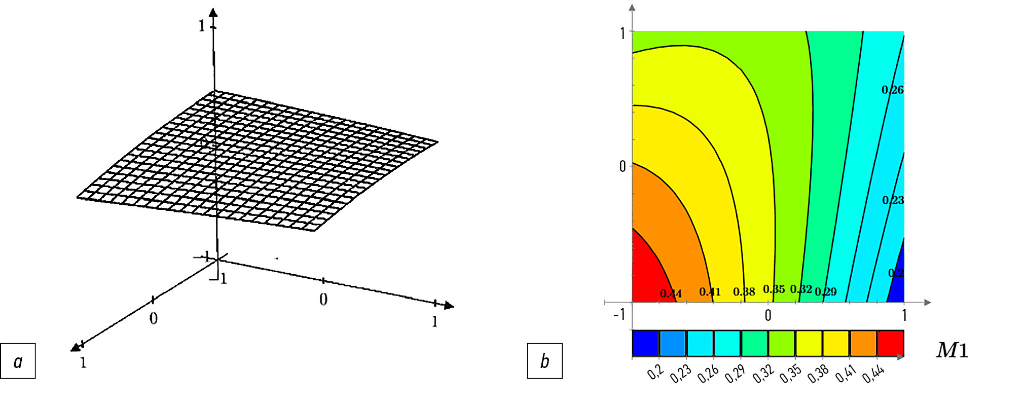 Рис. 3. Графики поверхности отклика Y1 (а) и линии уровня (b) при х1= 0, х2= –1...1, х3= –1...1.