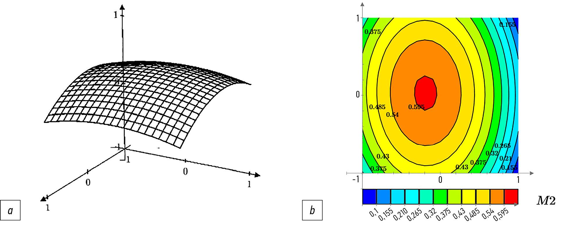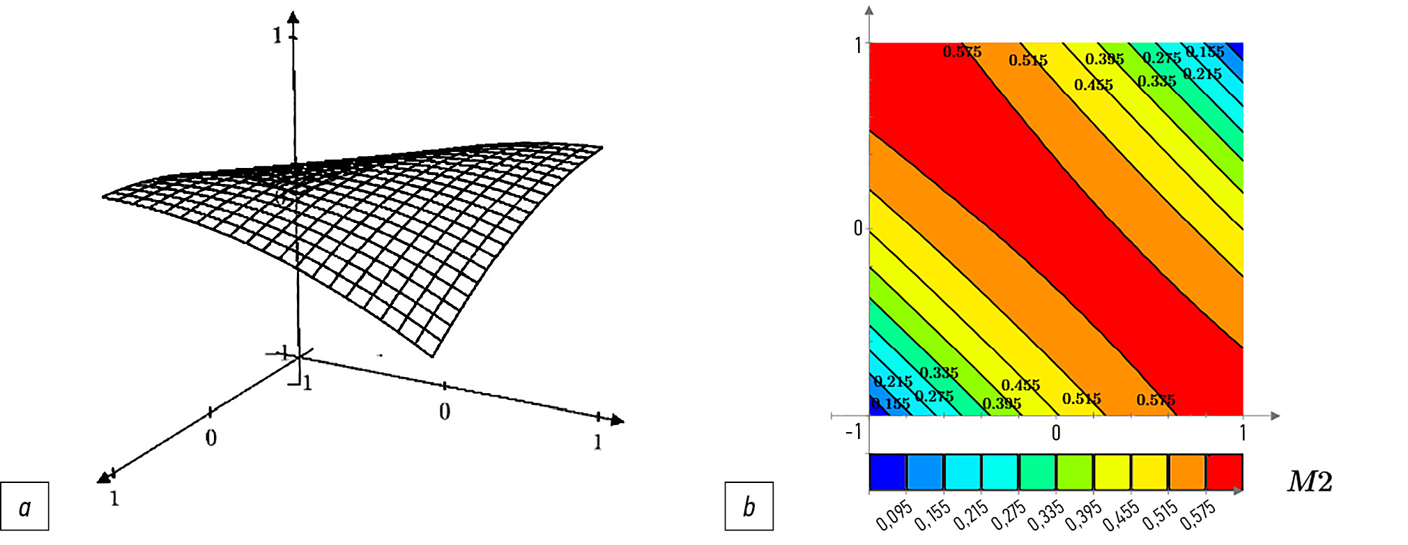 Рис. 6. Графики поверхности отклика Y2 (а) и линии уровня (b) при х1= 0, х2= –1...1, х3= –1...1.