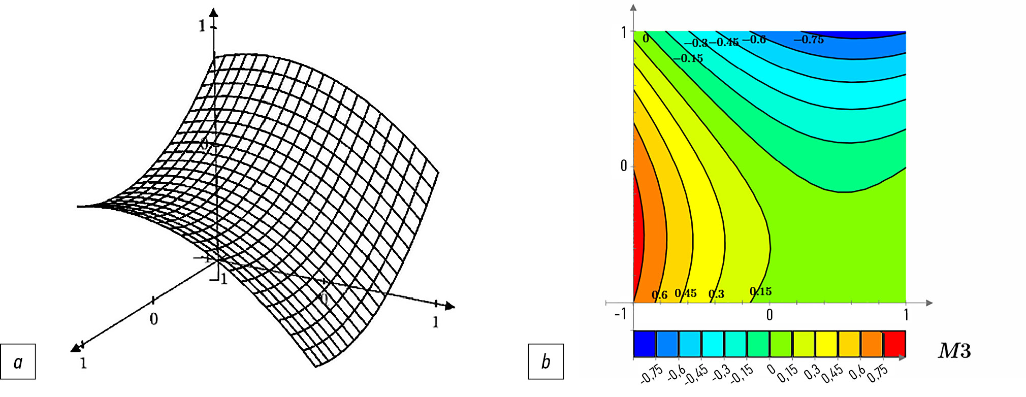 Рис. 10. Графики поверхности отклика Y3 (а) и линии уровня (b) при х1= –1...1, х2= 0, х3= –1...1.