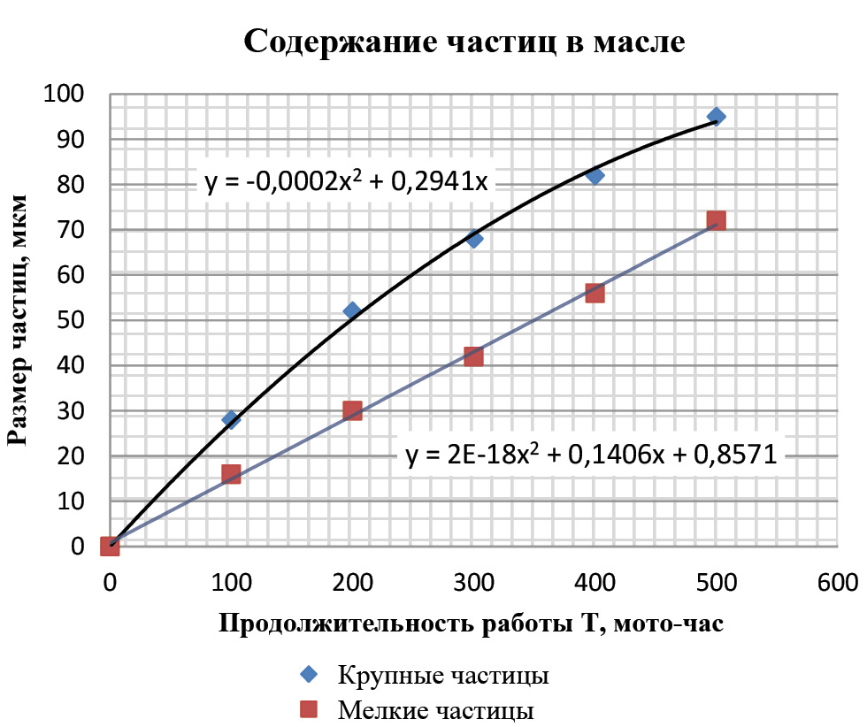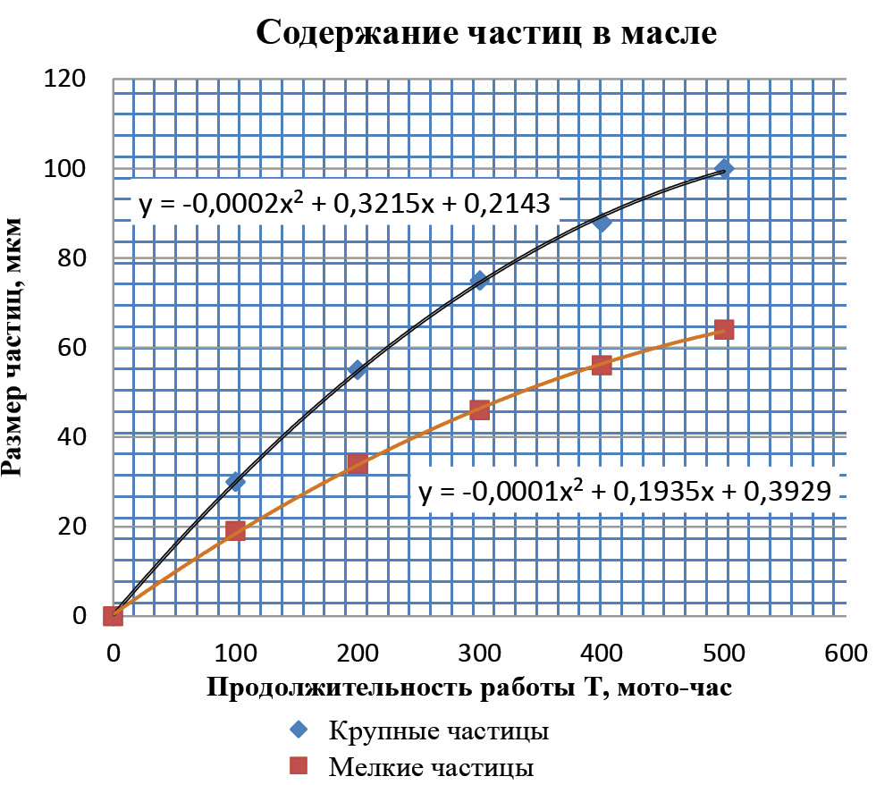 По росту наработки увеличивается размер частиц продуктов износа. Этот явление связано с ухудшением смазывающих способностей масла в результате влияния различных факторов и срабатываемости присадок в составе масла.