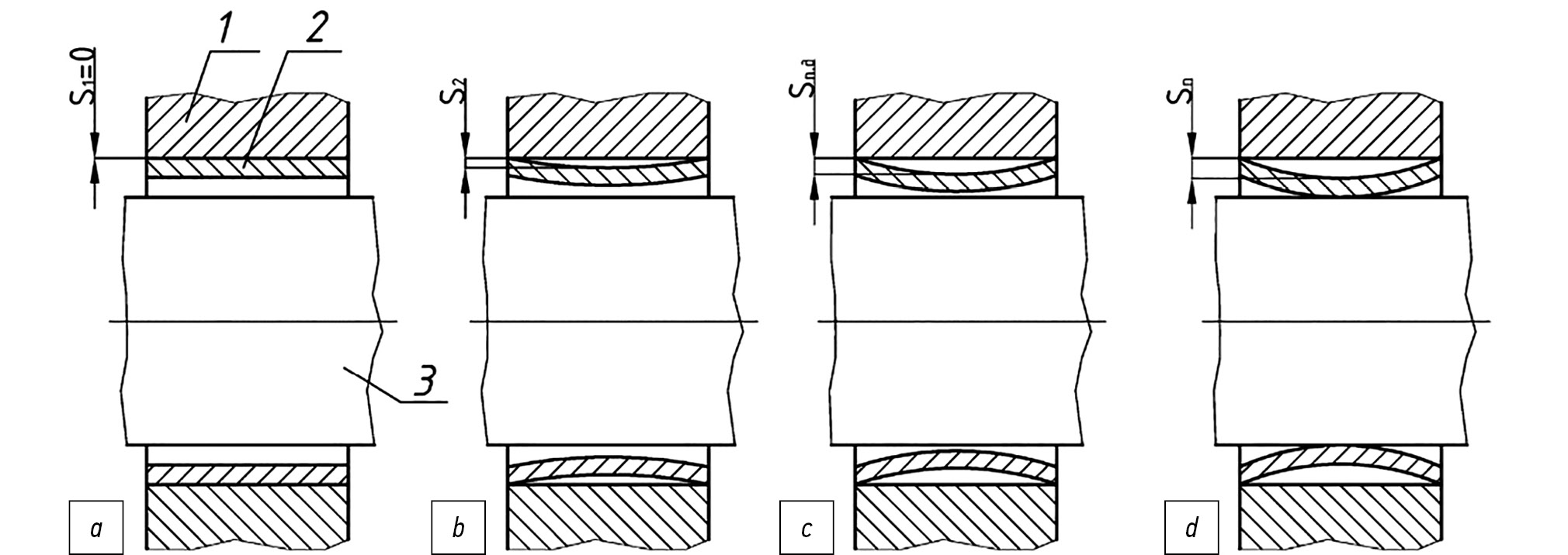 Fig. 1. Scheme of development of shape changes in connecting rod bearings with increasing deflection: 1: connecting rod, 2: bearing, 3: crankshaft; а: initial state of the connecting rod bearing without deflection; b: initial phase of deflection development; c: phase of the maximum permissible deflection of the liner; d: phase of maximum deflection of the liner; S1, S2, Sп.д, Sп : deflection measurements corresponding to the phases of development of shape formation.