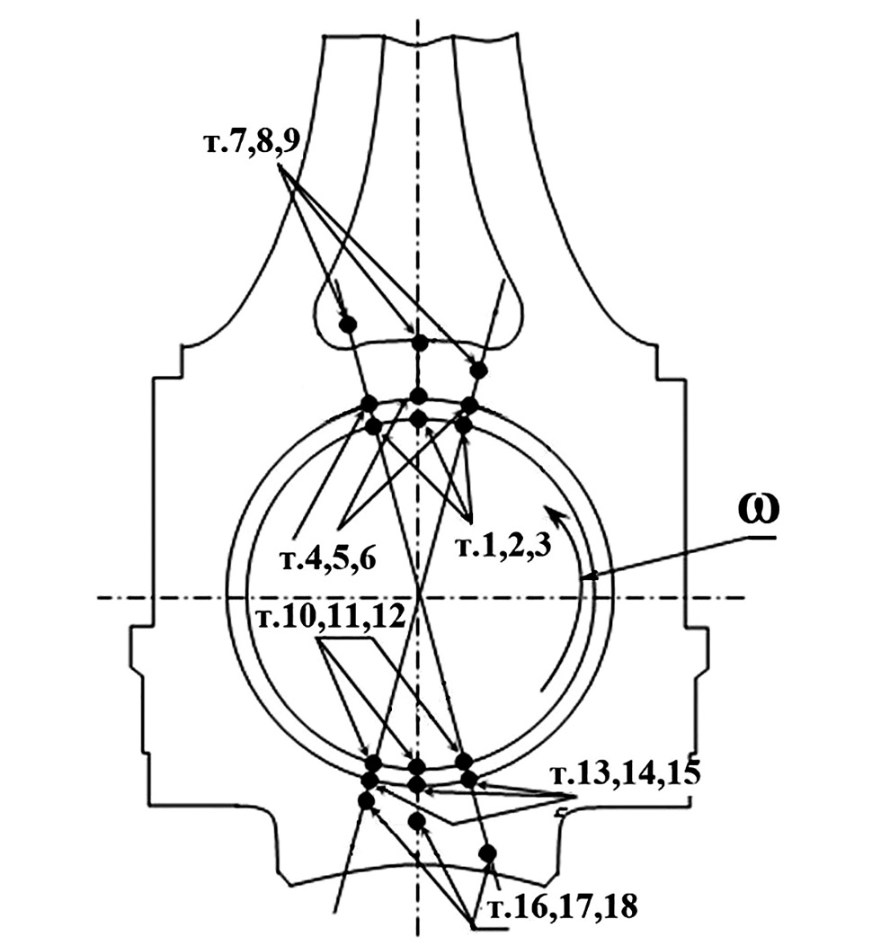 Рис. 2. Установка термопар во вкладыше и шатуне: т. 1…18 — точки установки термопар; ω — направление вращения вала.