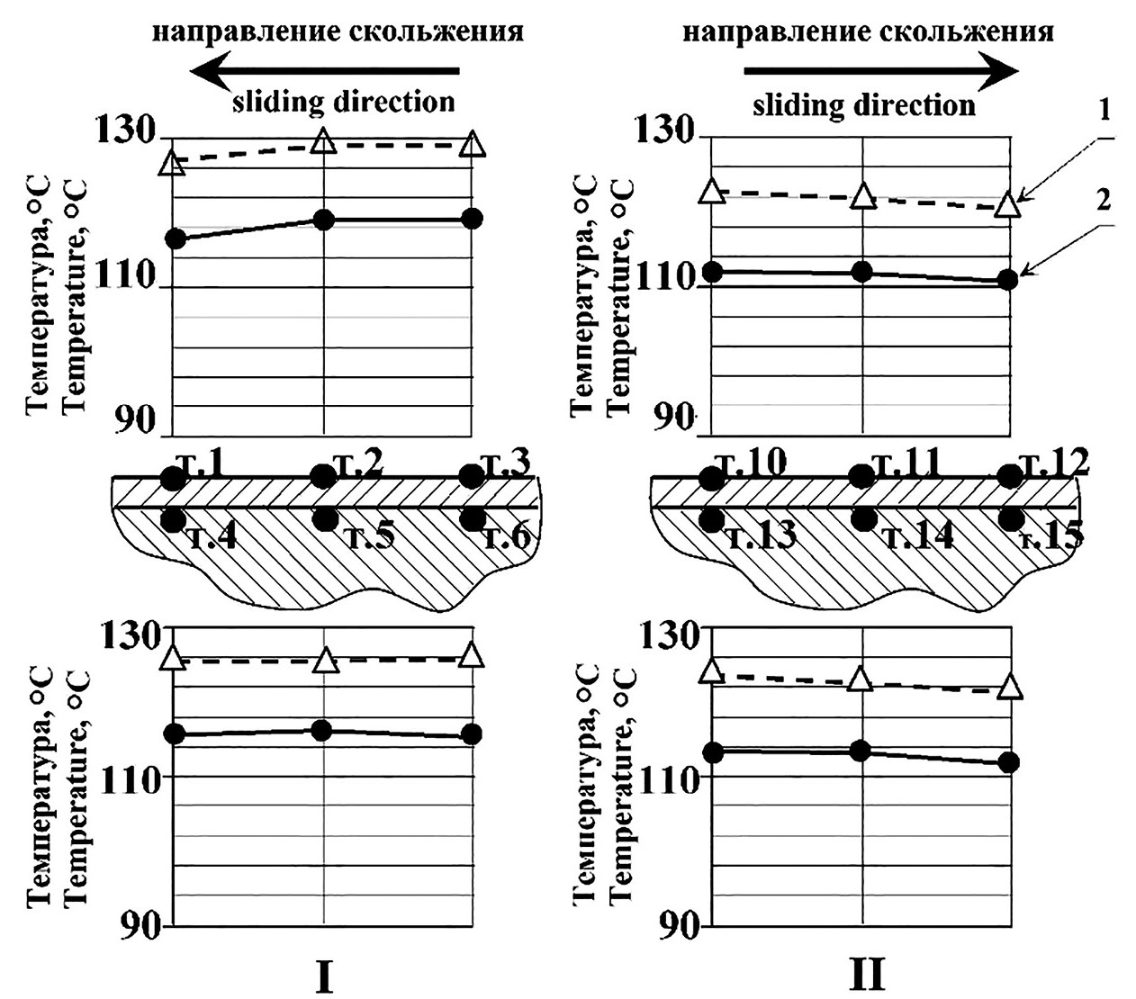 Рис. 3. Схемы распределения температур в местах установки термопар на рабочей и наружной поверхностях верхнего и нижнего шатунных вкладышей: I — верхний вкладыш; II — нижний вкладыш: 1 — холостой ход при частоте 2930 мин-1; 2 — номинальный режим при частоте 2600 мин-1.