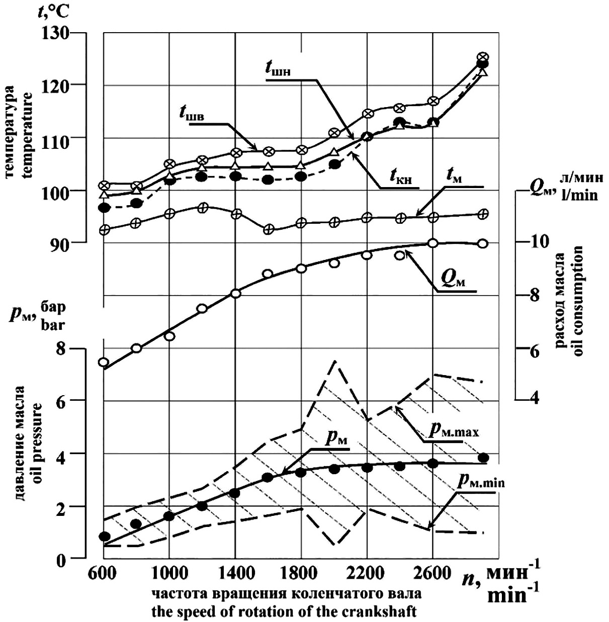 Fig. 4. Changes in the temperatures of the working surfaces of the liners and oil parameters according to full-load characteristic: tшн; tшв; tкн: average temperature of the connecting rod lower, upper and lower main liners; tм; pм; Qм: average temperature, pressure and oil consumption.
