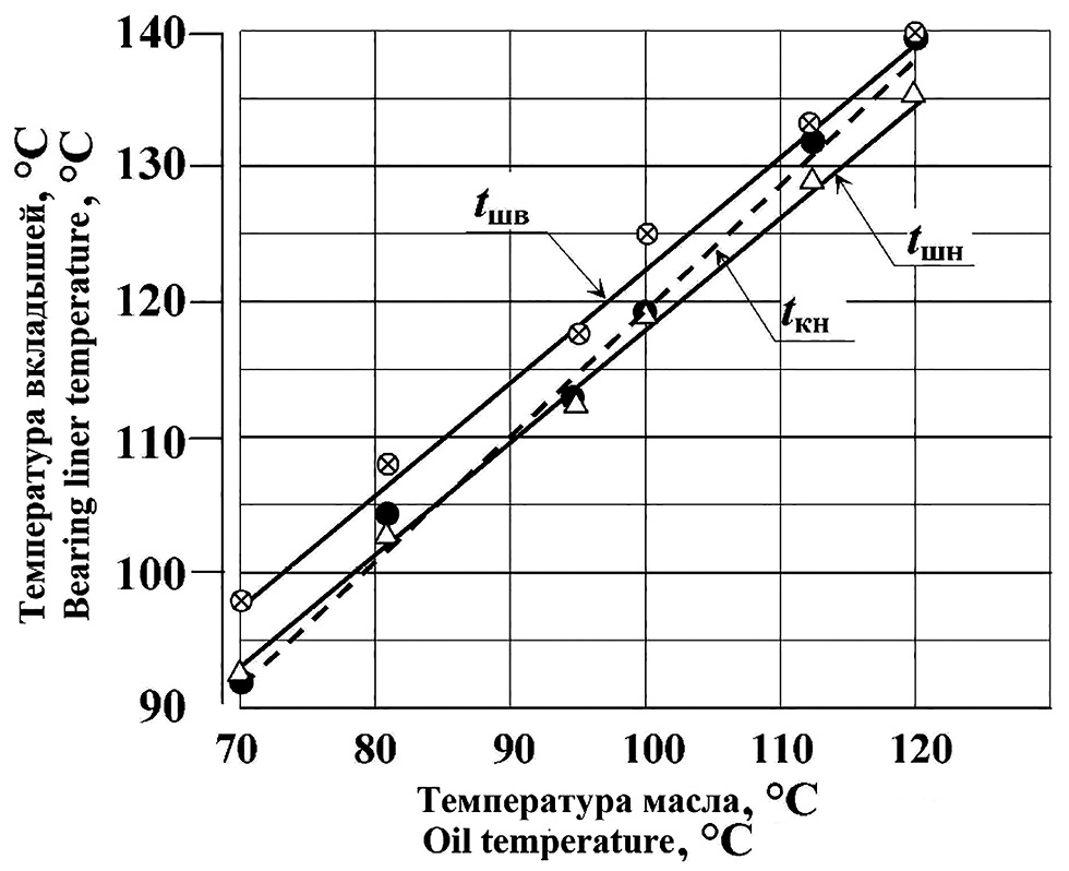 Установлена прямая пропорциональная зависимость между температурами вкладышей и масла на входе в коренной подшипник (рис. 5) — на номинальном режиме на каждые 10°С приращения температуры масла температура вкладышей растёт на величину от 8,5°С до 9,0°С.