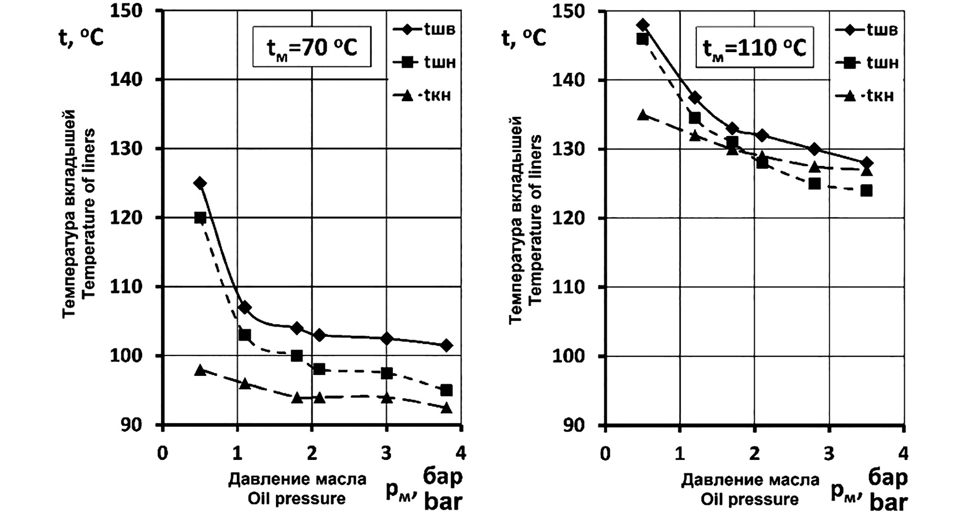 Установлено, что в диапазоне давлений масла от 1,5 бар до 4,5 бар изменение температуры вкладышей незначительно. А вот снижение давления ниже 1,5 бар вызывает заметный рост температуры вкладышей. При этом температура коренного вкладыша не растёт столь значительно, поскольку при этих условиях в коренном подшипнике сохраняется режим гидродинамического трения.