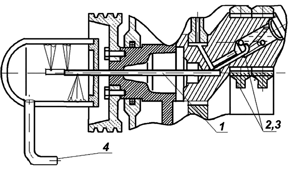Fig. 7. Scheme for determining pressure losses in the crankshaft channels due to the action of centrifugal forces and outflow modes from the connecting rod cavity: 1: tube from the channel along the axis of the crankshaft; 2 and 3: tubes from the connecting rod cavity; 4: slink.