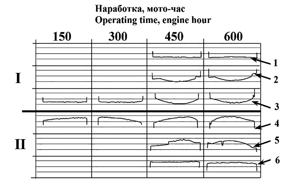 Fig. 8. Profile diagrams of the working and outer surfaces of the liners and connecting rod along the generatrix depending on engine operating hours during reliability tests: I: upper bearing liner; II: lower bearing liner: 1: connecting rod; 2: outer surface of liner; 3: working surface of liner; 4: working surface of liner; 5: outer surface of liner; 6: connecting rod cover.