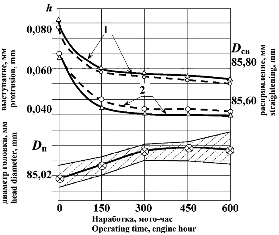 Изменение выступания h и распрямления Dсв, а также диаметр кривошипной головки шатуна Dп по ходу испытаний представлены на рис. 9.