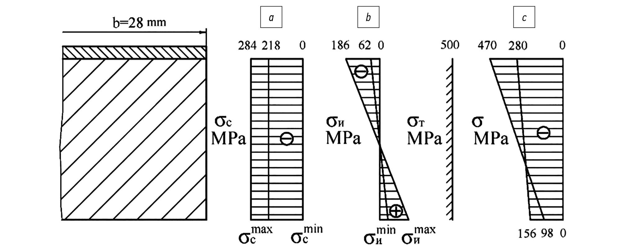 Fig. 10. Stress diagrams in the cross-section of the liner due to the liner tension (а), from the reduction in straightening (b) and the total assembly and thermal stresses (c); σс: stresses from compression; σи: stresses from bending; σТ: thermal stresses; σ: total stresses; b: liner width.
