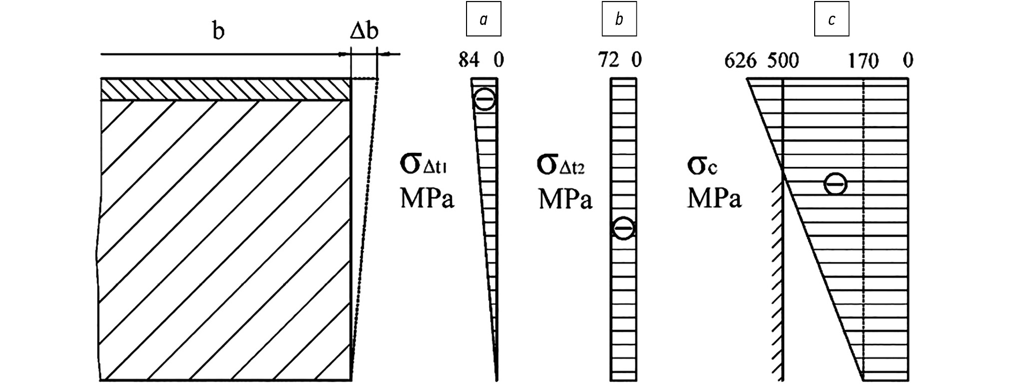 Fig. 11. Diagrams of stresses in the liner due to temperature changes (а, b) and total assembly and thermal stresses (c); σDt1, σDt2: stresses, respectively, from the temperature gradient along the thickness of the liner and between the liner and the bed; σс: compressive stress; σТ: thermal stresses; b: liner width; Δb: liner width extension.