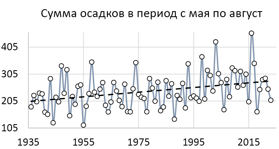 Fig. 3. Dynamics of changes in total precipitation during the growing season (May – August) in Saint Petersburg in the period of years 1936–2023.
