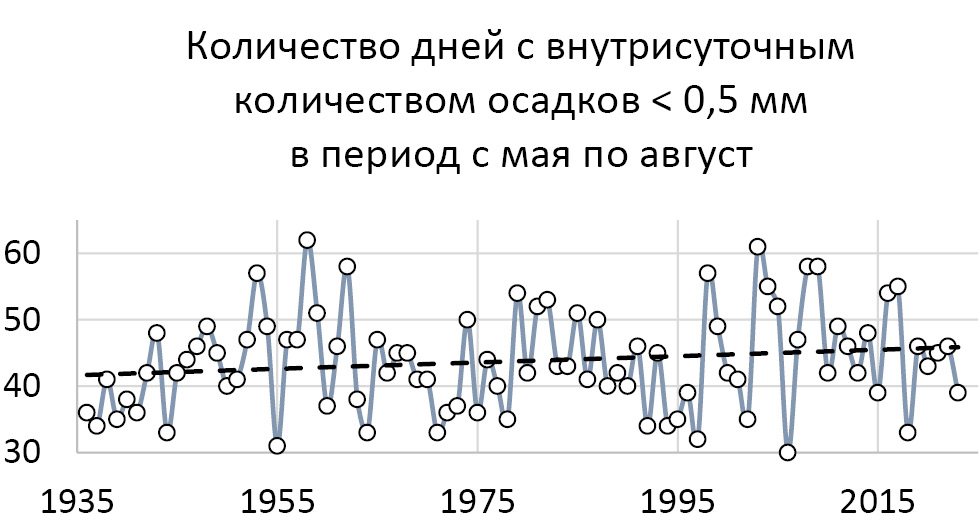 Fig. 4. Dynamics of changes in the number of days with precipitation during the growing season (May – August) in Saint Petersburg in the period of years 1936–2023.