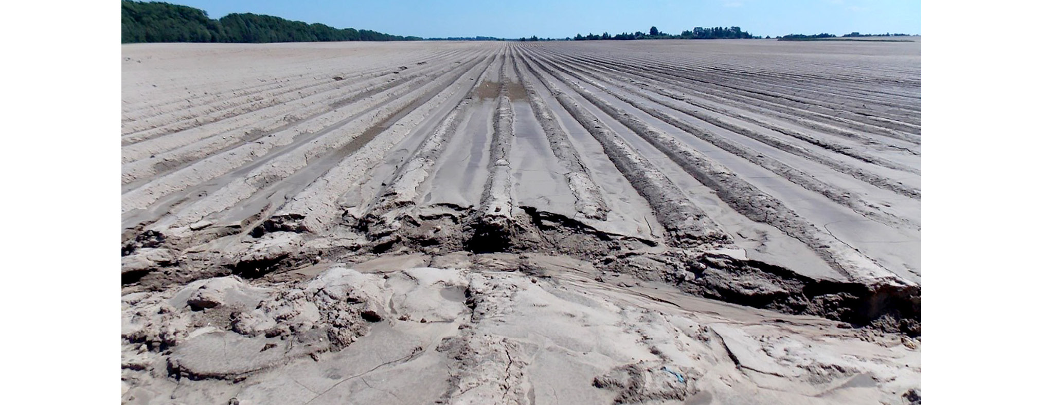 В особой степени риски проявления водной эрозии при выпадении ливневых дождей связаны со структурой почвы, на которую попадают капли дождя. Диаметр капель обычного дождя не превышает 1 мм, однако во время ливней выпадают капли диаметром свыше 2 мм [20, 21], что придаёт им высокую кинетическую энергию при падении на землю. Падение капель воды, обладающих высокой кинетической энергией, на незащищённую поверхность почвы приводит к разрушению почвенных частиц. В особой степени разрушению подвергаются почвенные элементы малого размера, сформированные фрезерными культиваторами-гребнеобразователями. Другим фактором риска, который существенно увеличивает потерю плодородного слоя на профилированной поверхности, является применение гребнеобразующих плит в составе культиваторов-гребнеобразователей [22]. При работе таких устройств поверхность почвы приглаживается плитой по всему периметру гребня и крупные капли, падающие на его верхнюю и боковые части, выбивают из массива мелкие почвенные элементы и вместе с ними стекают на дно борозды, а далее уносятся вниз по склону. Последствия этого процесса на посадках картофеля после выпадения ливневых осадков показаны на рис. 5.