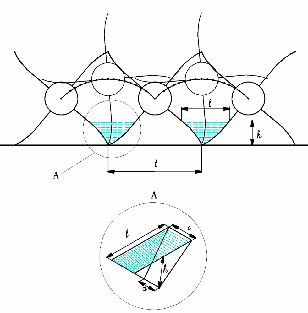 Теоретический расчёт технологических параметров лункователя выполнен на основе построенных траекторий перемещения его лопастей во время выполнения рабочего процесса (рис. 6). При воздействии лункователя на почву передняя и задняя стенки лунки образованы его лопастью путём смятия рыхлой почвы при перекатывании с шагом t относительно неподвижной точки на глубине h = 200 мм. Шаг лункователя t определяется конструктивными параметрами ротора: диаметр D и количество лопастей на нём. При этом лунка образуется в виде треугольной наклонной призмы, поперечное сечение которой представляет собой трапецию с нижним основанием, равным а = 120 мм, а верхним — с = 160 мм. После построения траектории движения лопасти установлено, что теоретическое значение длины лунки составляет l = 300 мм. На основании этих данных был определён объём лунки, который формируется лопастью лункователя. Он составляет V = 0,0044 м3.