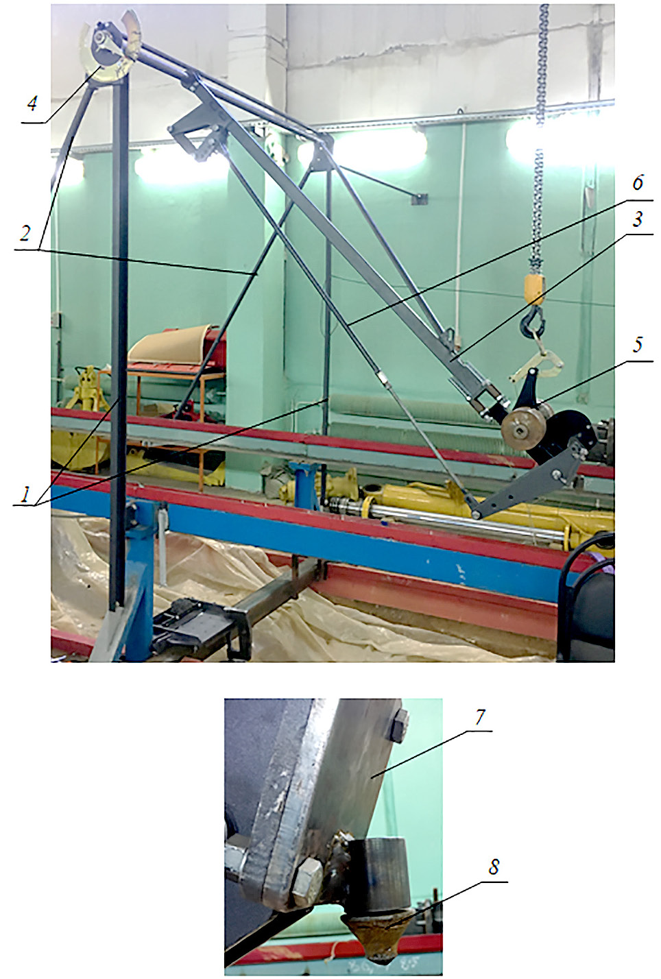 Fig. 1. Pendulum-type test bench: a: frame; 1: column; 2: extension rod; 3: lever; 4: limb; 5: adjustable lever; 6: lever system; b: tool holder: 7: setting pad; 8: cutter. Compiled by the authors.