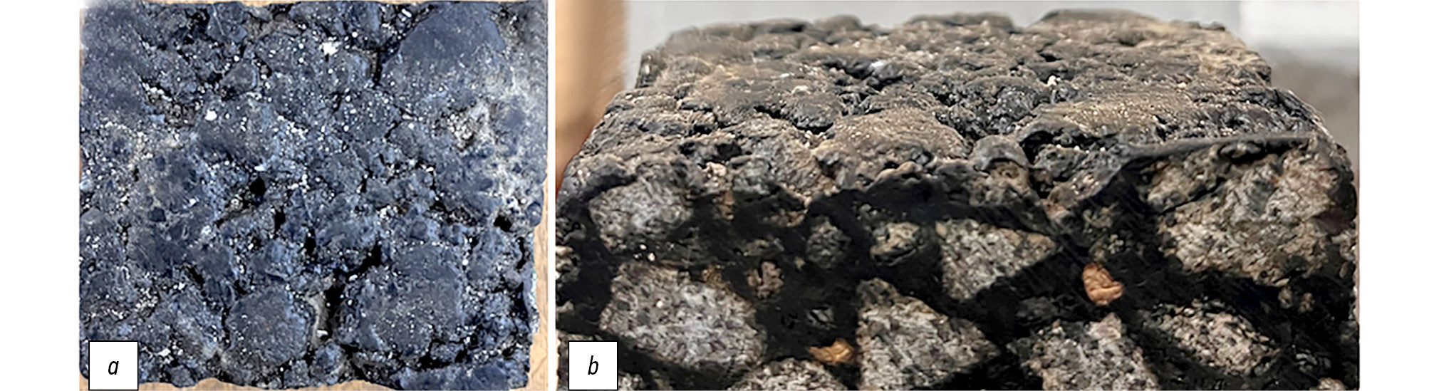 Рис. 2. Внешний вид образца асфальтобетона марки А16вн: a — вид сверху; b — вид сбоку. Составлено авторами.