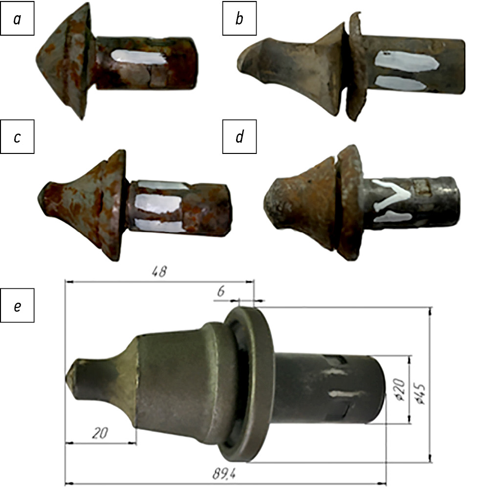 Рис. 3. Разноизношенные режущие элементы дорожной фрезы, используемые для проведения эксперимента: a — чрезмерный износ; b — неравномерный износ корпуса резца и наконечника; c — резец с деформированной шайбой и фиксирующей втулкой; d — правильный износ; e — режущий элемент модели А8/20. Составлено авторами.