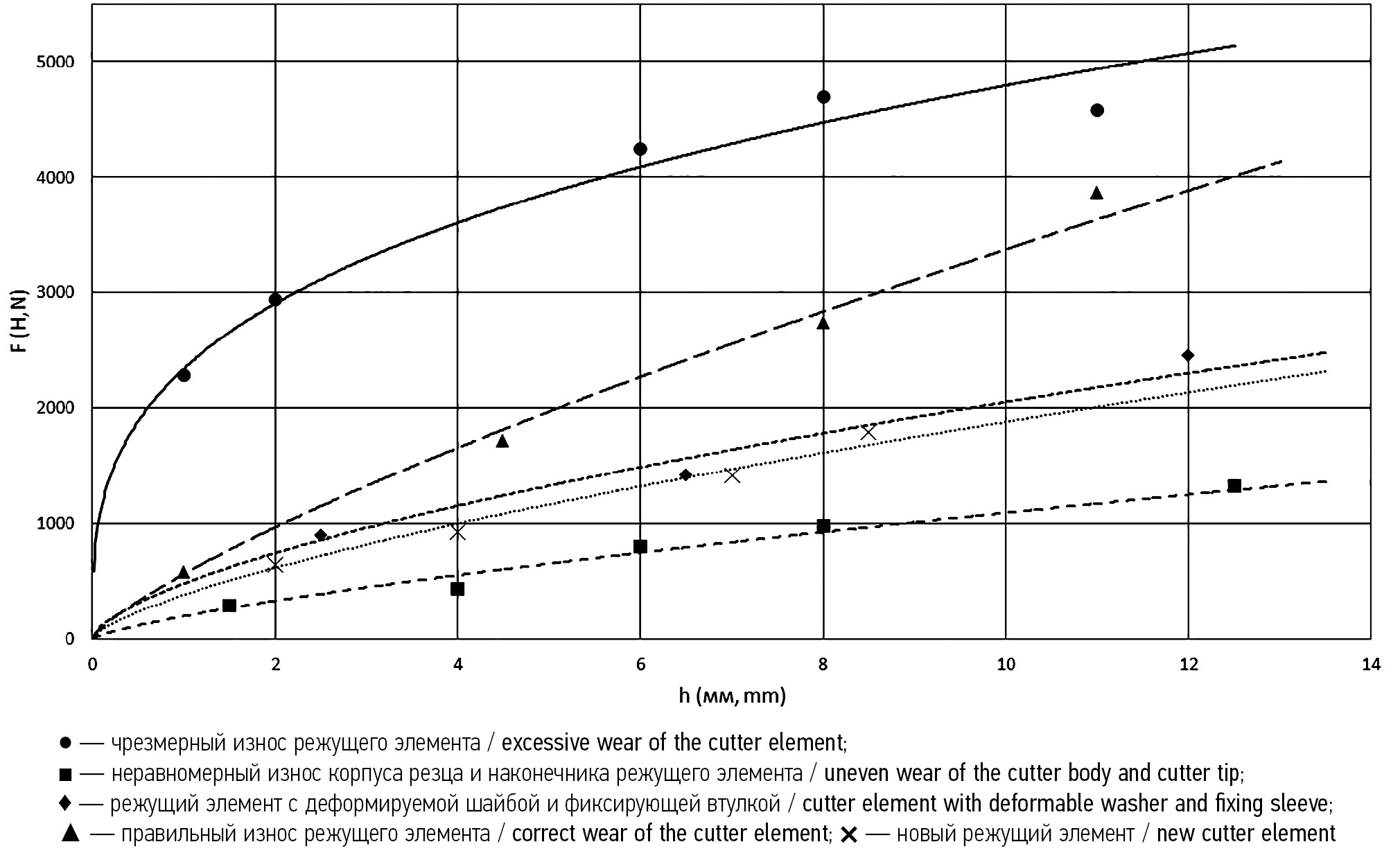 Fig. 4 Graph of the dependence of the cutting resistance forces (F) on the type of wear of the cutting element and the thickness of the chip to be cut (h) of the A16vn asphalt concrete. Compiled by the authors.