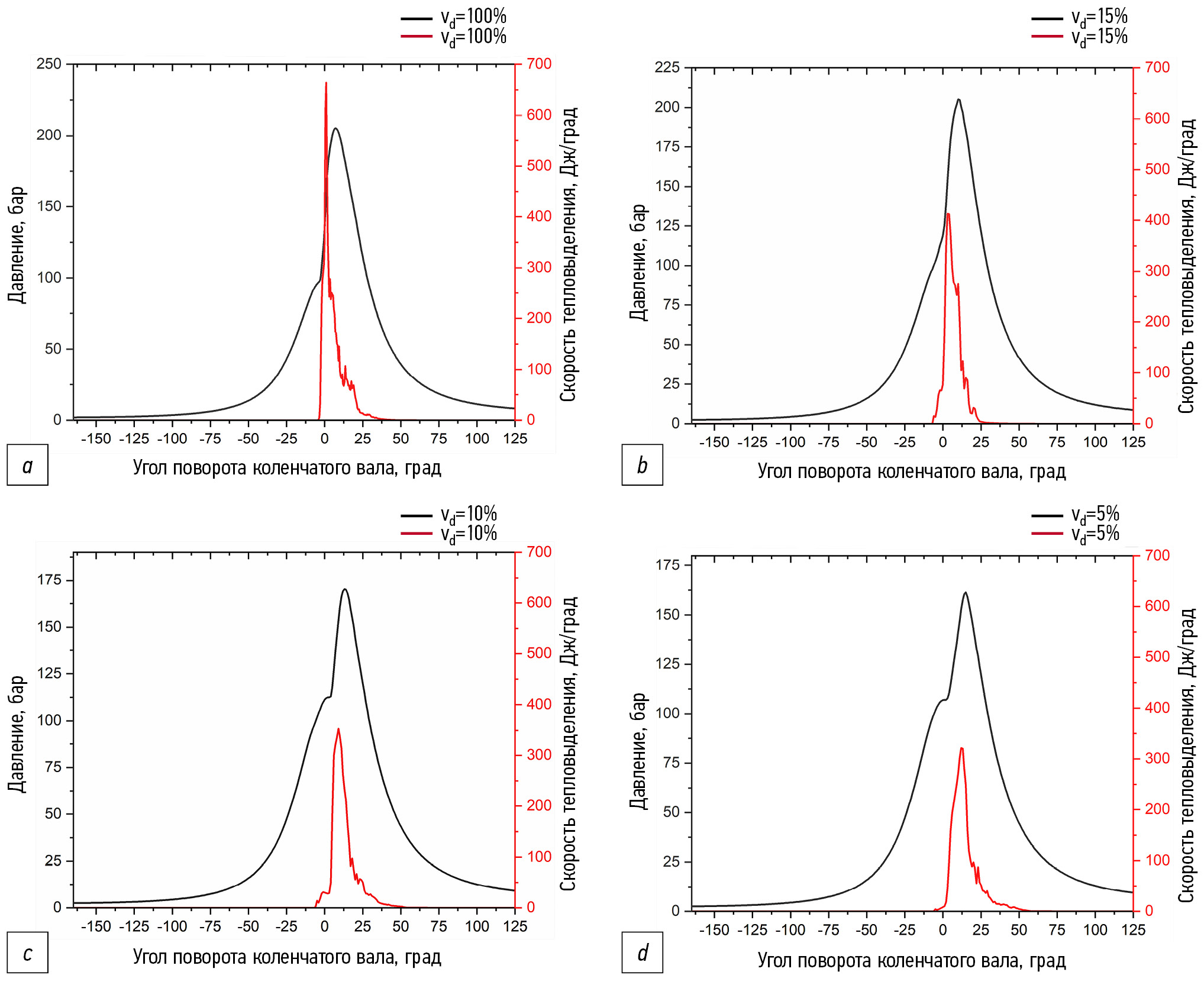 При уменьшении дозы дизельного топлива со 100% до 5% максимальное давление снижается на 26% с 217 бар до 161 бар. При этом также значительно снижается скорость тепловыделения и увеличивается задержка воспламенения на 5 град п.к.в. Величина запальной дозы определяется отношением массы дизельного топлива в двухтопливном режиме, к массе дизельного топлива в дизельном режиме на номинальной мощности .