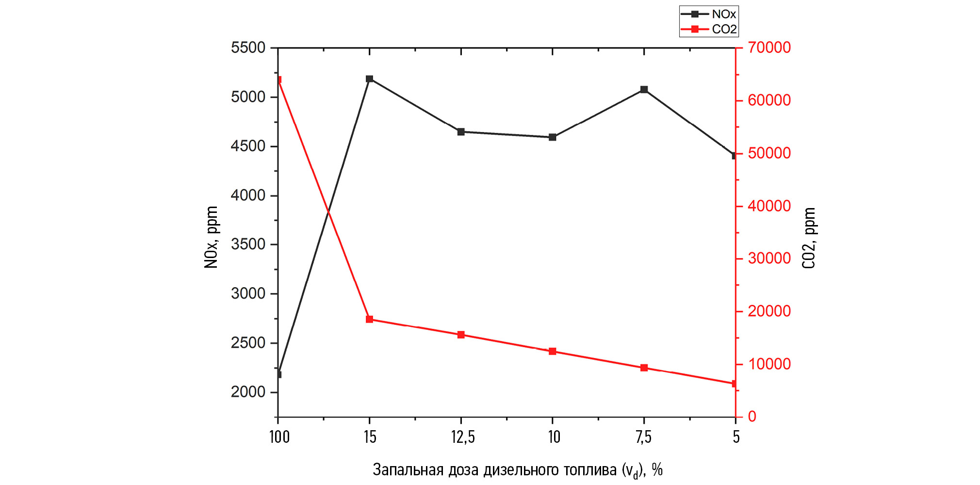 Рис. 3. Зависимость концентраций NOx и СО2 в отработавших газах газодизеля ЯМЗ-53415, работающего на аммиаке, от запальной дозы дизельного топлива.