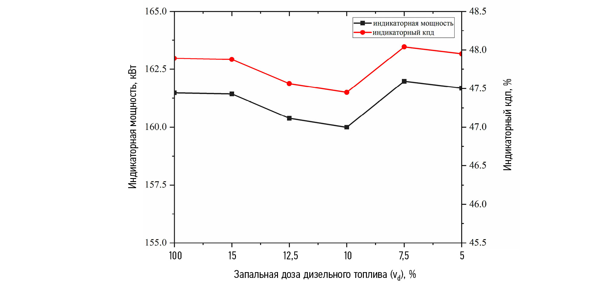 Как видно из рис. 4, при переходе с дизельного режима на двухтопливный с различными запальными дозами дизельного топлива изменение индикаторной мощности и индикаторного кпд незначительное, находится в пределах от 160 кВт до 162 кВт для индикаторной мощности и от 47,5% до 48% для индикаторного кпд. При этом наилучшие показатели достигнуты при запальной дозе 7,5%.
