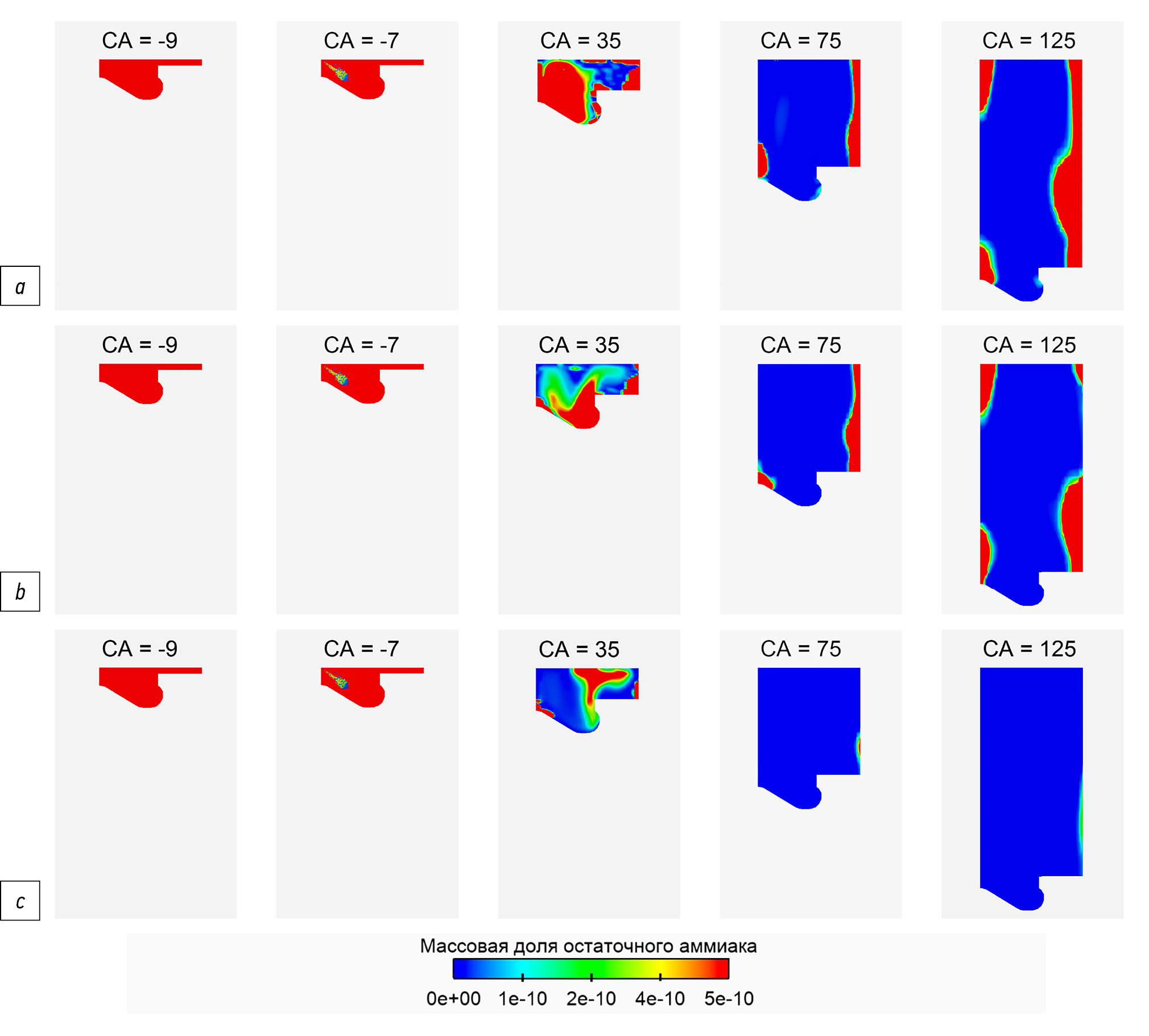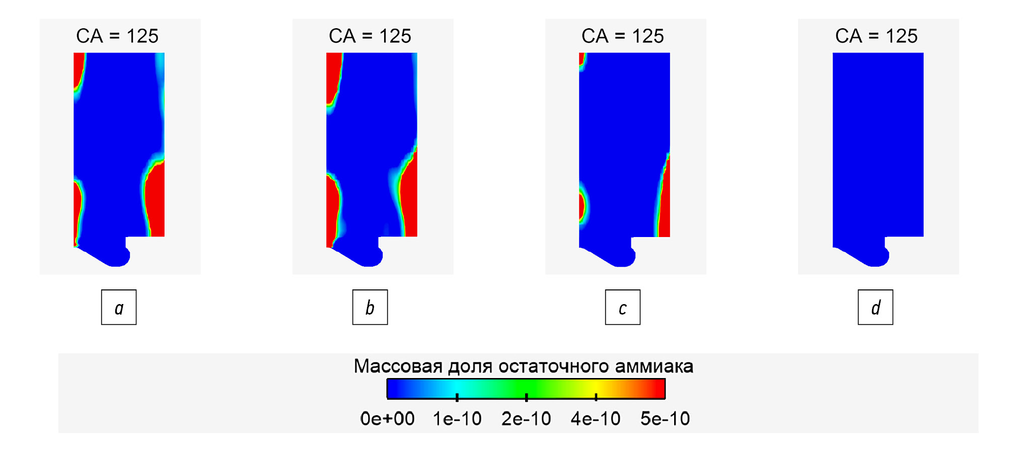 Видно, что массовая доля аммиака, оставшегося в цилиндре при открытии выпускного клапана после сгорания топлива в цилиндре двигателя, изменяется по мере увеличения запальной дозы дизельного топлива, и при наименьшей запальной дозе 5% масса остаточного аммиака наибольшая. При увеличении запальной дозы дизельного топлива остаточное количество аммиака уменьшается, но всё равно значительно превышает предельно допустимые концентрации. Необходимо улучшить процесс сгорания, чтобы аммиак полностью сжигался в цилиндре. Одним из возможных способов решения этой задачи является добавление в аммиачно-воздушную смесь газодизельного двигателя водорода, небольшое количество которого значительно ускоряет процесс сгорания аммиака.