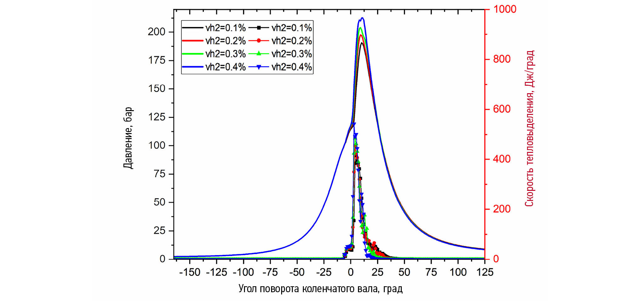 Рис. 6. Зависимость давления и скорости тепловыделения в цилиндре газодизеля ЯМЗ-53415, работающего на аммиаке с запальной дозой дизельного топлива и различными добавками водорода.