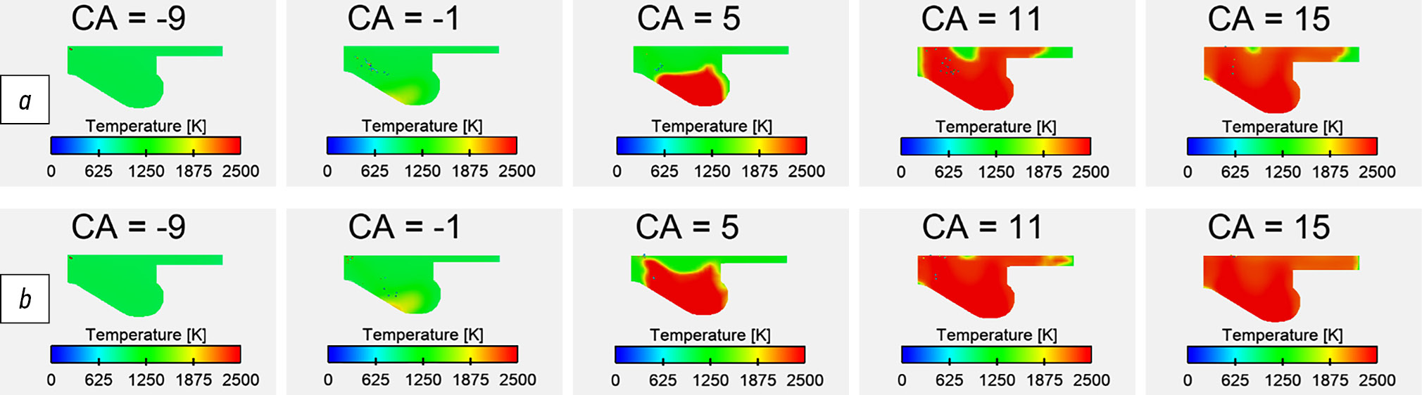 Рис. 7. Распределение температуры в цилиндре газодизеля ЯМЗ-53415, работающего на аммиаке с запальной дозой дизельного топлива 10% и различными добавками водорода: .