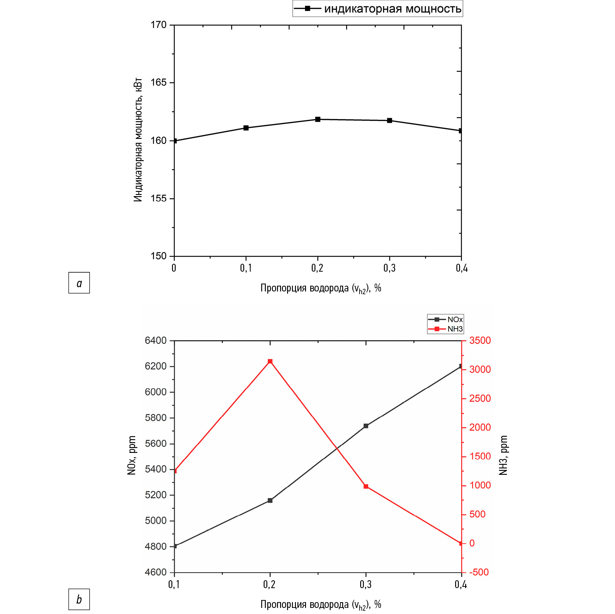 На рис. 8 показана зависимость индикаторного кпд и концентраций NOx и СО2 в отработавших газах газодизеля с увеличением добавки водорода. Индикаторная мощность двигателя изменяется в небольшом диапазоне и незначительно повышается по сравнению с вариантом без подачи водорода.