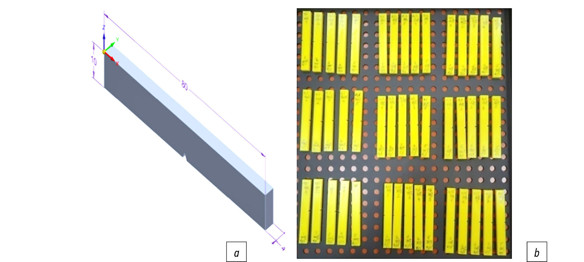 Рис. 1. Образцы, использованные для экспериментов: a — электронная модель образца, b — фото натурных образцов, подвергнутых отжигу.