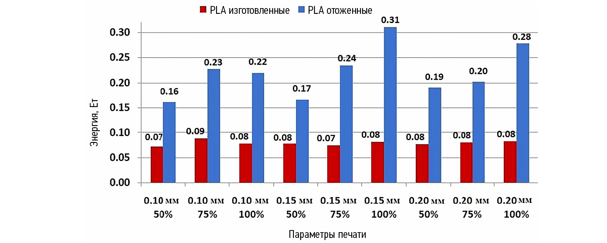На рис. 4 показаны средние значения поглощённой энергии удара в зависимости от параметров печати (толщина слоя и процент заполнения) как для неотожжённых, так и для отожжённых образцов.