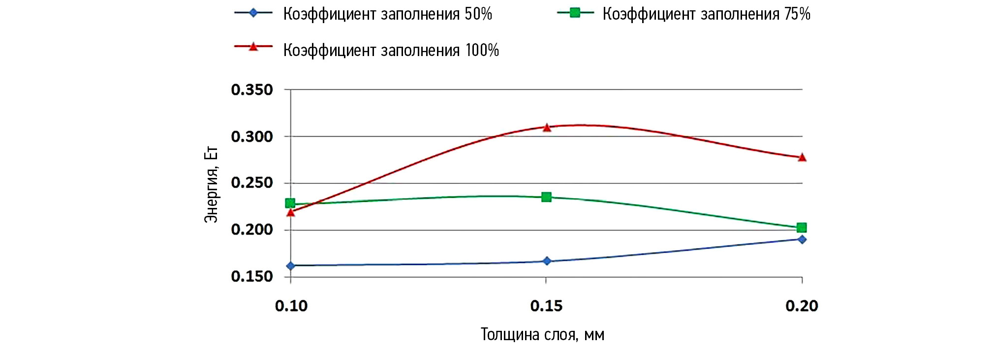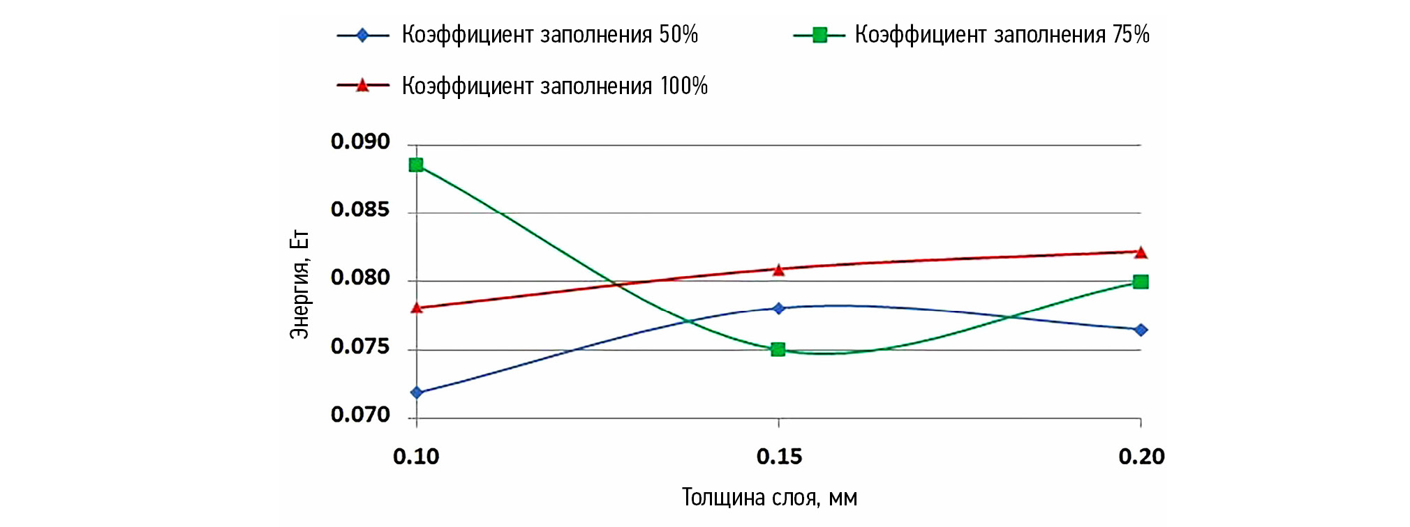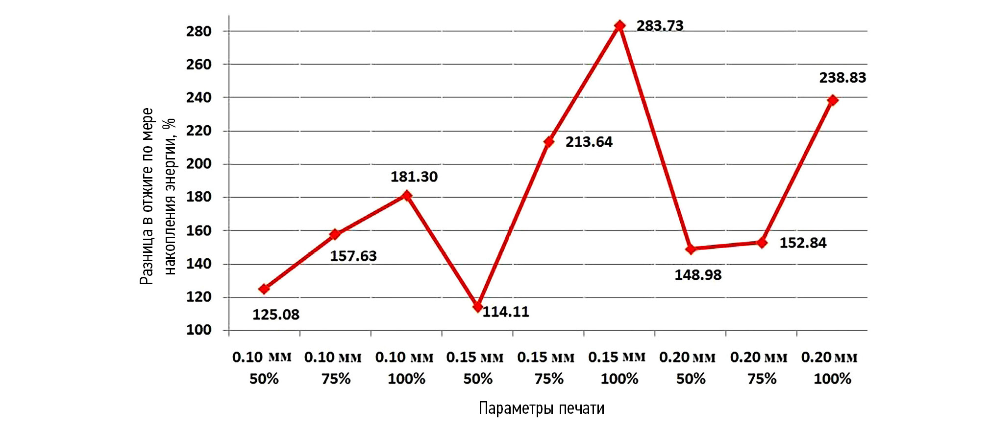 Для образцов, изготовленных в соответствии со стандартными параметрами, максимальная поглощённая энергия удара была достигнута при 75%-ном заполнении и толщине слоя 0,1 мм, в то время как минимальное значение наблюдалось при 50%-ном заполнении и толщине слоя 0,2 мм (рис. 6).