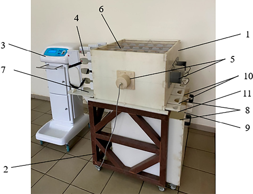 Fig. 1. An industrial facility for electromagnetic exposure on grain seeds: 1 — a box; 2 — a frame; 3 — a control unit; 4 — panels-irradiators; 5 — moisture gauges; 6 — walls; 7 — a shelf, 8, 9 — containers; 10, 11 — discharging covers.