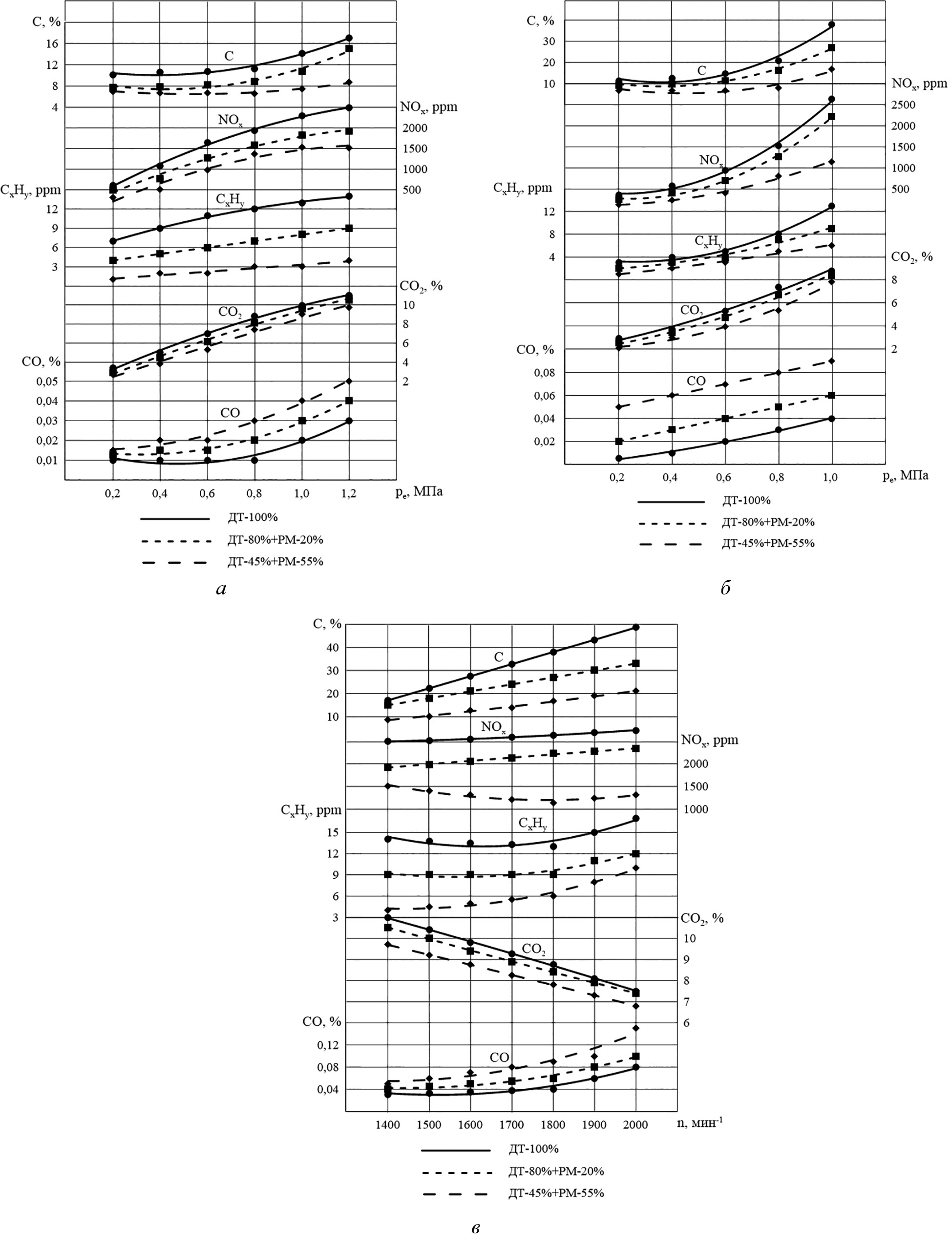 Figure 1 shows graphs of the dependence of the environmental performance of the diesel engine at n = 1400 min-1 and n = 1800 min-1 with various MF compositions on the load and the crankshaft speed.