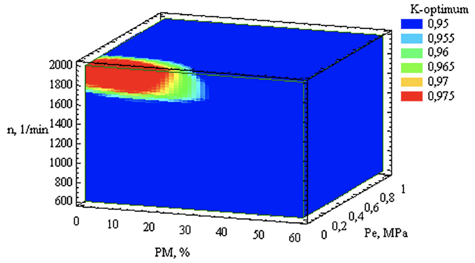 Fig. 3. Dependence of the optimality criterion (k-optimum) on the average effective pressure pe, MPa, the share of RO by mass in MF, % and the crankshaft rotation speed n, min–1 of D-245.5S diesel engine (4ChN 11,0/12,5)
