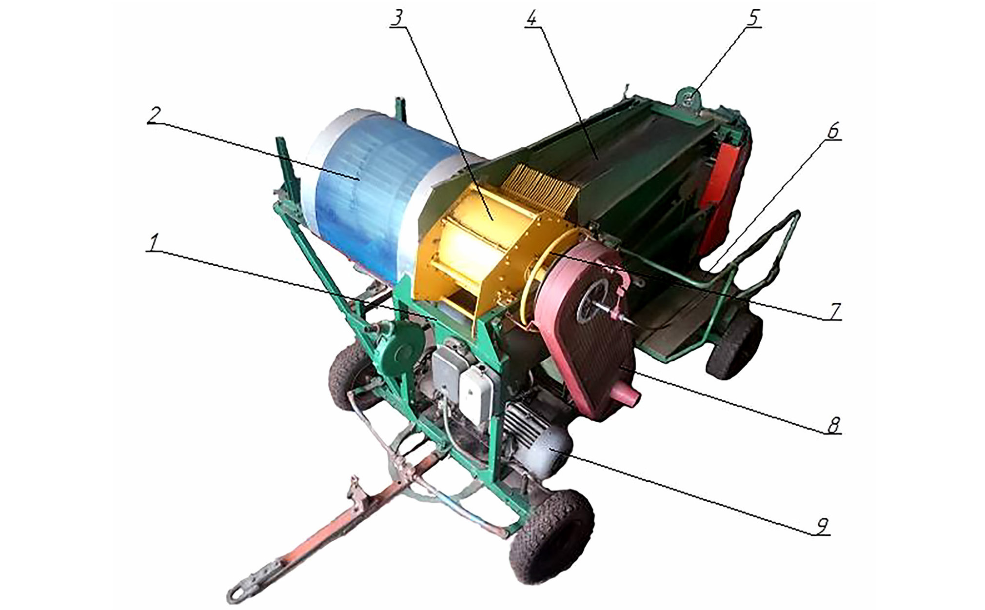 Рис. 2. Молотилка АРПМСУ: 1 — основание; 2 — молотильно-сепарирующее устройство; 3 — шнек-питатель; 4 — подающий транспортер; 5 — тахометр контроля оборотов ротора; 6 — площадка оператора; 7 — штурвал регулирования оборотов ротора; 8 — защитный кожух клиноременного вариатора; 9 — электродвигатель.