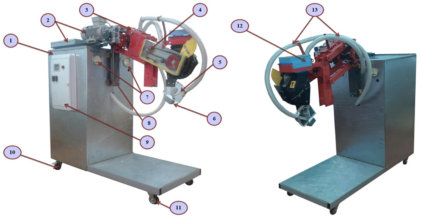 На рис. 1 обозначено: 1 – корпус стенда; 2 – электродвигатель 220 В с редуктором для вращения высевающего диска высевающего аппарата и коробом для хранения провода электропитания, закрепленные на кронштейне; 3 – высевающий аппарат сеялки фирмы MaterMacc (мод. 3XL); 4 – цепная передача; 5 – пневматическое устройство; 6 – датчик регистрации семян; 7 – тягомер мембранный, показывающий Тм МП–100–М1; 8 – кронштейн для установки высевающего аппарата на специализированном оборудовании; 9 – электрический щит монтажный с панелью; 10 и 11 – колеса (задние и передние соответственно) для передвижения специализированного оборудования; 12 – бункер для засыпки семян; 13 – пневмошланги.