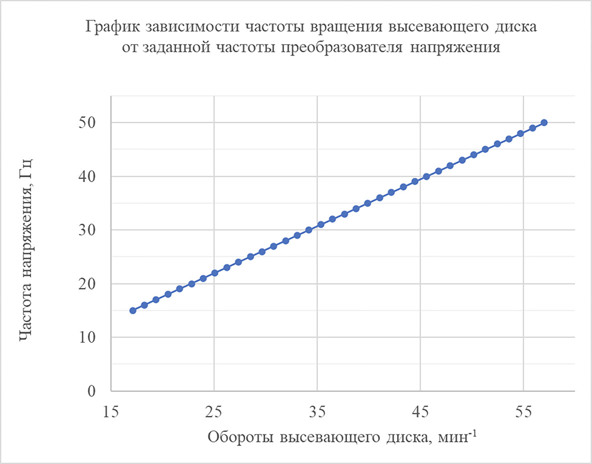 График зависимости оборотов высевающего диска от заданной частоты преобразователя напряжения приведен на рис. 4.