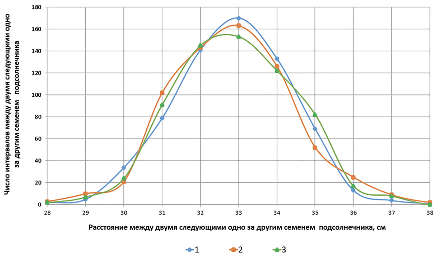 Предметом исследования является процесс высева семян высевающим аппаратом и показатели качества их распределения в рядок. Цель исследований – обоснование рационального технологического процесса распределения семян пропашных культур в рядок пневматическим высевающим аппаратом. Применялось специальное оборудование в системе обеспечения оборотов высевающего диска, присасывания семян к его отверстиям, пневмотранспорта семян после отделения от отверстия высевающего диска для контактного взаимодействия с приемной площадкой датчика числа семян и осаждения в сборнике. Новизна исследований заключается в применении акустического датчика единичной регистрации высеваемых высевающим аппаратом семян с малым промежутком времени, позволяющего проводить оценку качества работы высевающего аппарата по среднеквадратическому отклонению семян от заданной нормы их высева в нормальном их распределении в соответствии с законом больших чисел. Режим работы пневматического высевающего аппарата с применением специализированного оборудования в составе испытательного стенда осуществлялся на примере высева семян подсолнечника с нормой высева 3 шт./пог. м для условной скорости движения сеялки 9 км/ч. Полученные данные с различными промежутками времени между регистрируемыми семенами представлялись в формате *.WAV программой «PTC Mathcad Prime» классовыми распределениями семян в графическом виде и в табличной форме. Качественные показатели семян для посева и их классовое распределение в рядок рациональными режимами работы высевающего аппарата, оцениваемые специализированным оборудованием при применении закона больших чисел, являются основой научных исследований по прогнозированию урожайности пропашных культур.