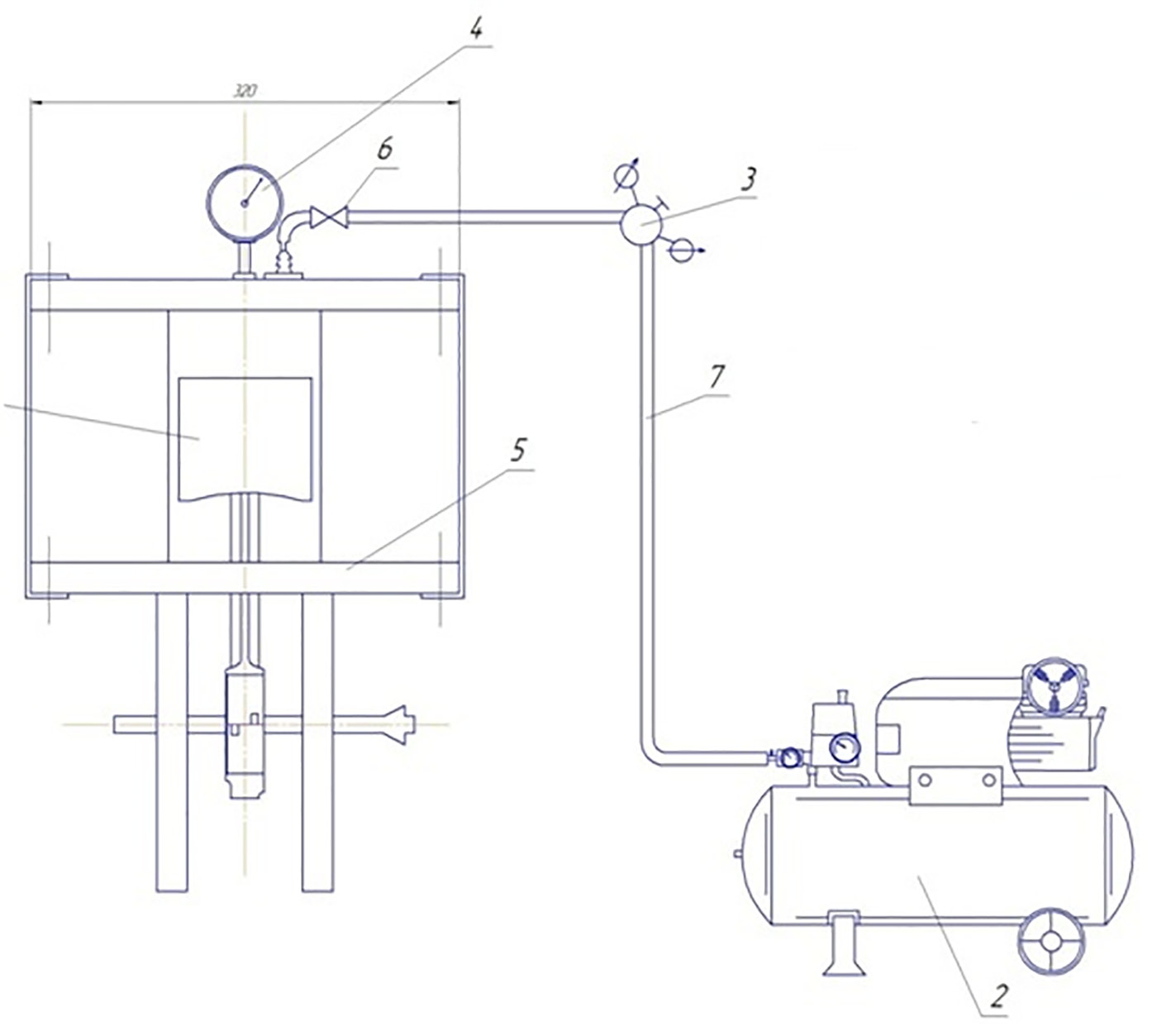 Рис. 1. Схема устройства: 1 – ЦПГ; 2 – компрессор; 3 – редуктор; 4 – манометр; 5 – анализатор герметичности цилиндров; 6 – кран; 7 – шланг