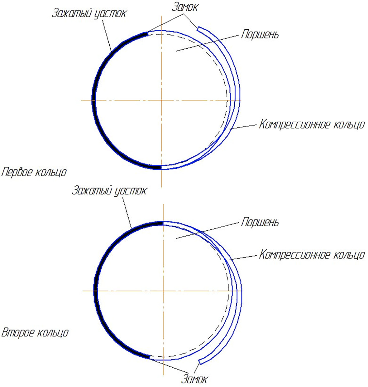 Чтобы смоделировать отказы, связанные с заклиниванием колец, вручную заклинили компрессионные кольца путем их вклеивания в канавку с одной стороны от замка по схеме, приведенной на рис. 3.