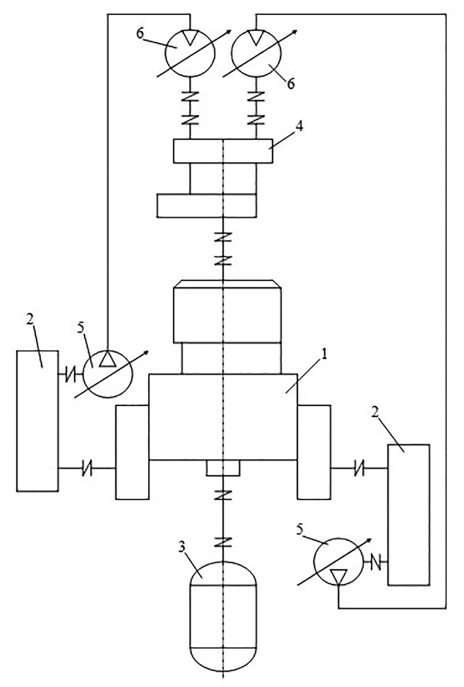 Рис. 2. Гидрокинематическая схема стенда: 1 – испытуемая трансмиссия с гидротрансформатором; 2 – согласующий редуктор; 3 – приводная балансирная машина; 4 – раздаточная коробка; 5 – гидронасос системы нагружения; 6 – гидромотор системы нагружения