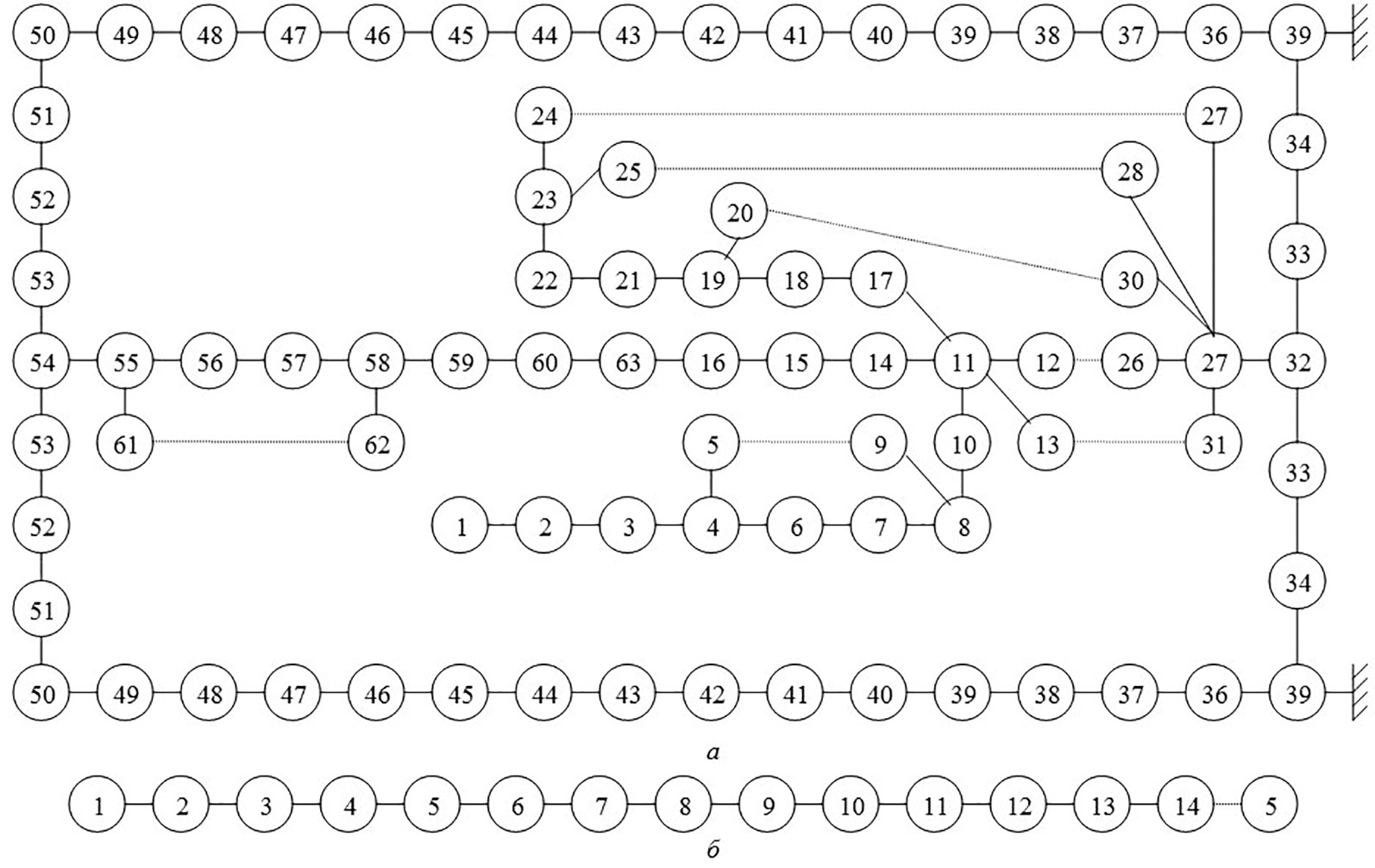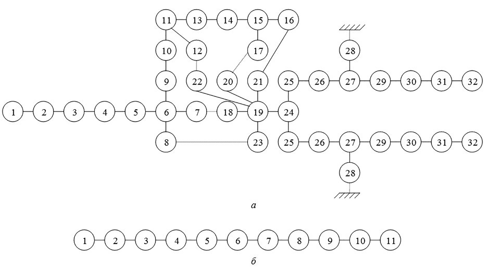 Начальная и редуцированная динамические модели трансмиссии стенда приведены на рис. 3, трактора ДТ-175С – на рис. 4. Полная модель трансмиссии трактора включает в себя 33 сосредоточенные массы, редуцированная – 11, соответственно модели стенда – 63 и 14 масс. В таблице 1 приведены значения моментов инерции и жесткости связей масс полной и редуцированной моделей трансмиссии стенда, в таблице 2 – полной и редуцированной моделей трансмиссии трактора [7].