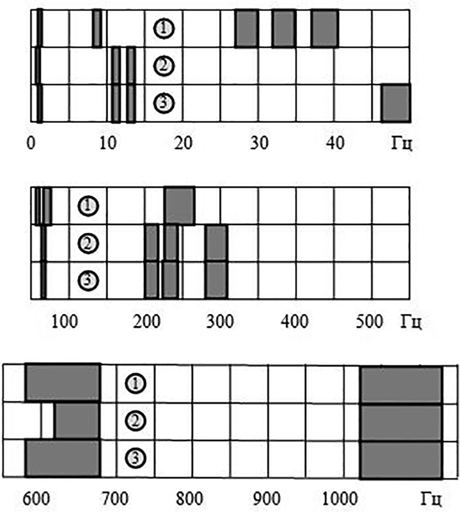 На рис. 5 представлен полученный расчетным путем при помощи созданного в ВолгГТУ программного комплекса DASP [11] спектр собственных частот трансмиссии трактора на первой передаче (ширина околорезонансной зоны для каждой собственной частоты принята равной 5 % от ее значения) и спектр собственных частот трансмиссии стенда с первоначальными и с измененными значениями параметров. Цифрой 1 обозначен спектр трансмиссии стенда до изменения параметров, цифрой 2 – спектр трансмиссии трактора, цифрой 3 – спектр трансмиссии стенда после изменения.
